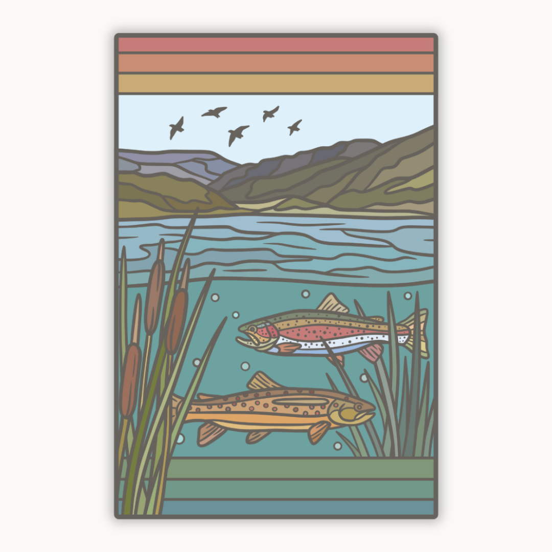 This detailed design showcases the unique beauty of Cave Lake State Park, where clear mountain waters meet abundant wildlife. Below the surface, a rainbow trout and a brown trout glide among cattails, while above, the serene lake reflects the surrounding mountains and a quiet sky dotted with birds. Peaceful, layered, and full of movement, this sticker captures the spirit of this Nevada gem.