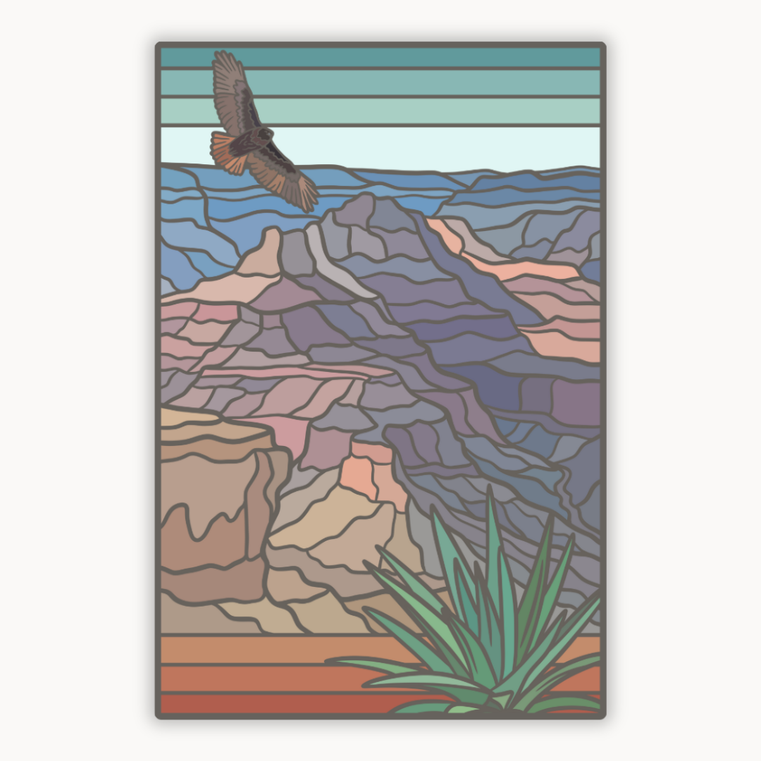 This design showcases the vast, layered expanse of the Grand Canyon as seen from the South Rim, where rocky cliffs stretch endlessly into the horizon. In the foreground, the sharp, sculptural leaves of Utah agave—native to the canyon rim—anchor the scene. A red-tailed hawk soars overhead, a symbol of freedom and perspective. With a subtly colorful, retro-inspired style, this sticker captures the timeless grandeur of one of Earth’s most iconic landscapes.