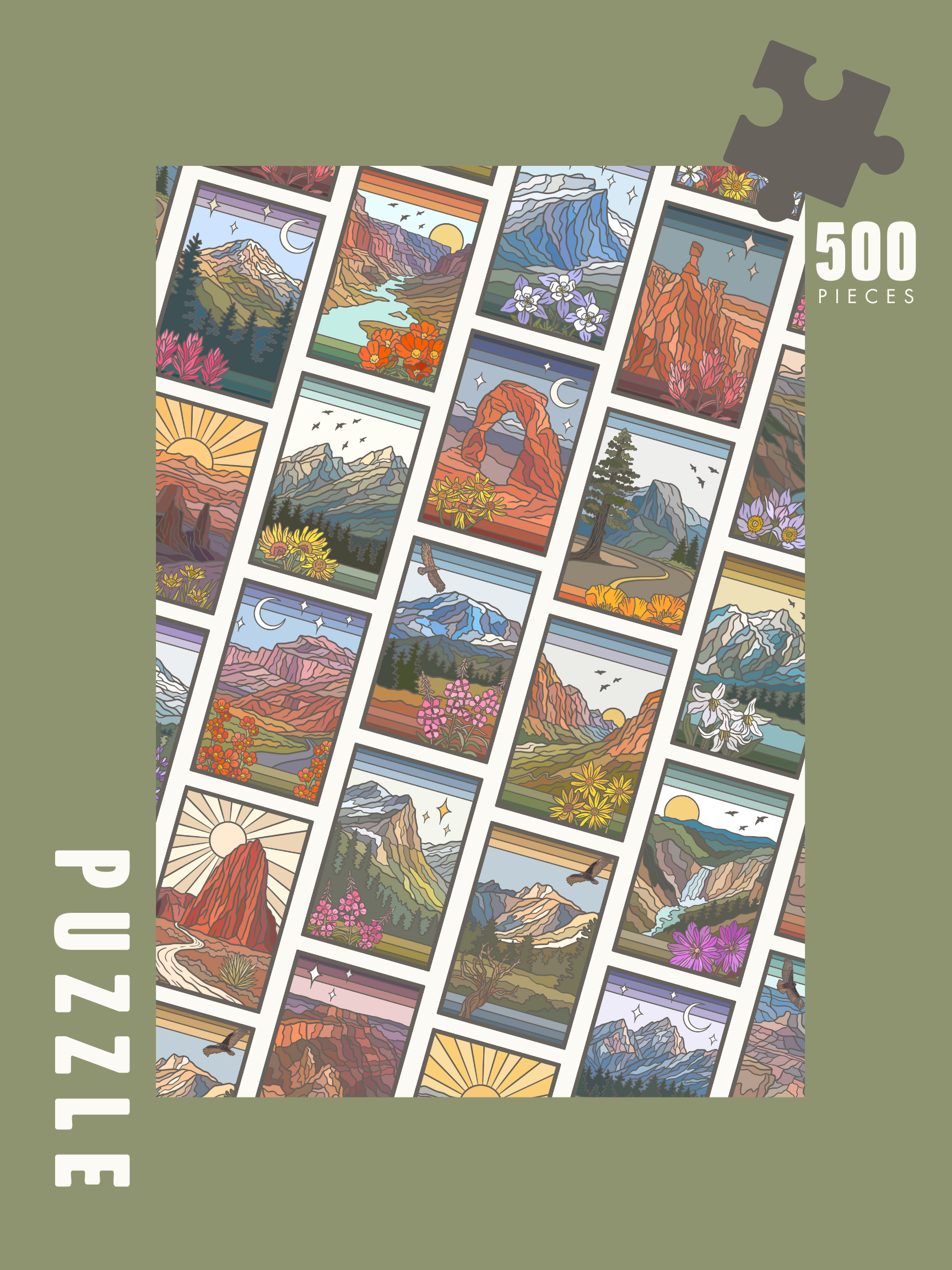 Designed to celebrate the landscapes that inspire us most, this puzzle brings together original illustrations of some of America’s most iconic national parks—each created with color, detail, and a spirit of adventure. As the pieces come together, they take you on a journey through meadows of alpine wildflowers, golden sunlight dancing through desert canyons, and across landscapes crowned by some of the nation’s most iconic and rugged peaks.