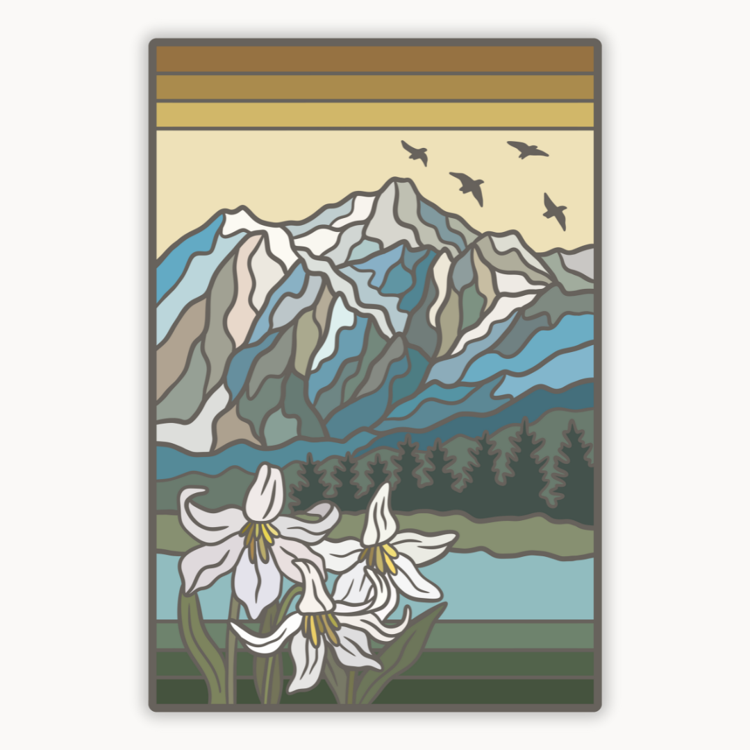 This design captures the rugged, remote beauty of North Cascades National Park. A still alpine lake mirrors the jagged mountain peaks that define this wild landscape, while delicate white glacier lilies bloom in the foreground. With cool tones and a subtle retro style, this sticker evokes the raw serenity of the North Cascades backcountry.