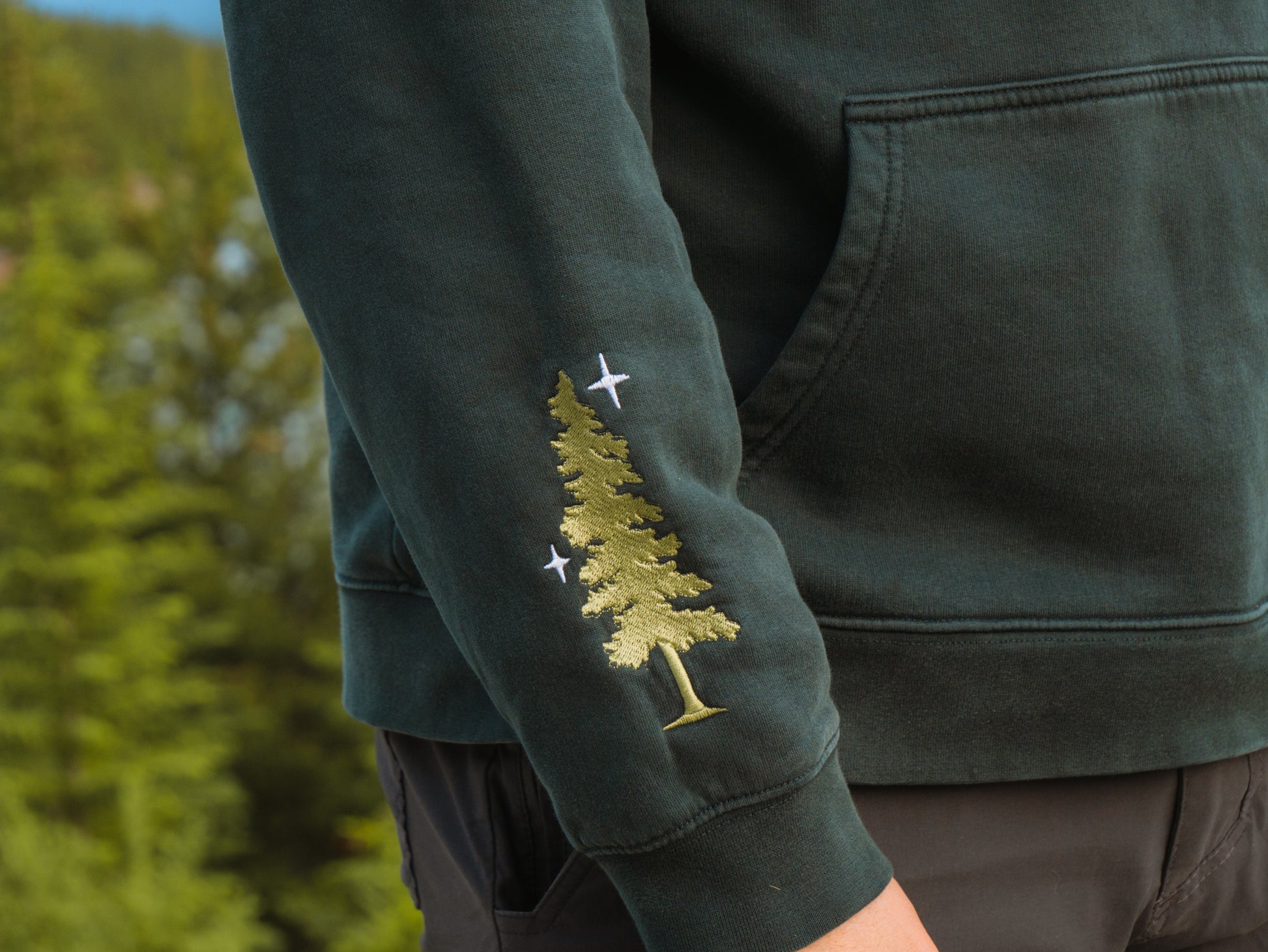 • Chest embroidery: pine trees, “Roaming Heart,” “Est. 2019”