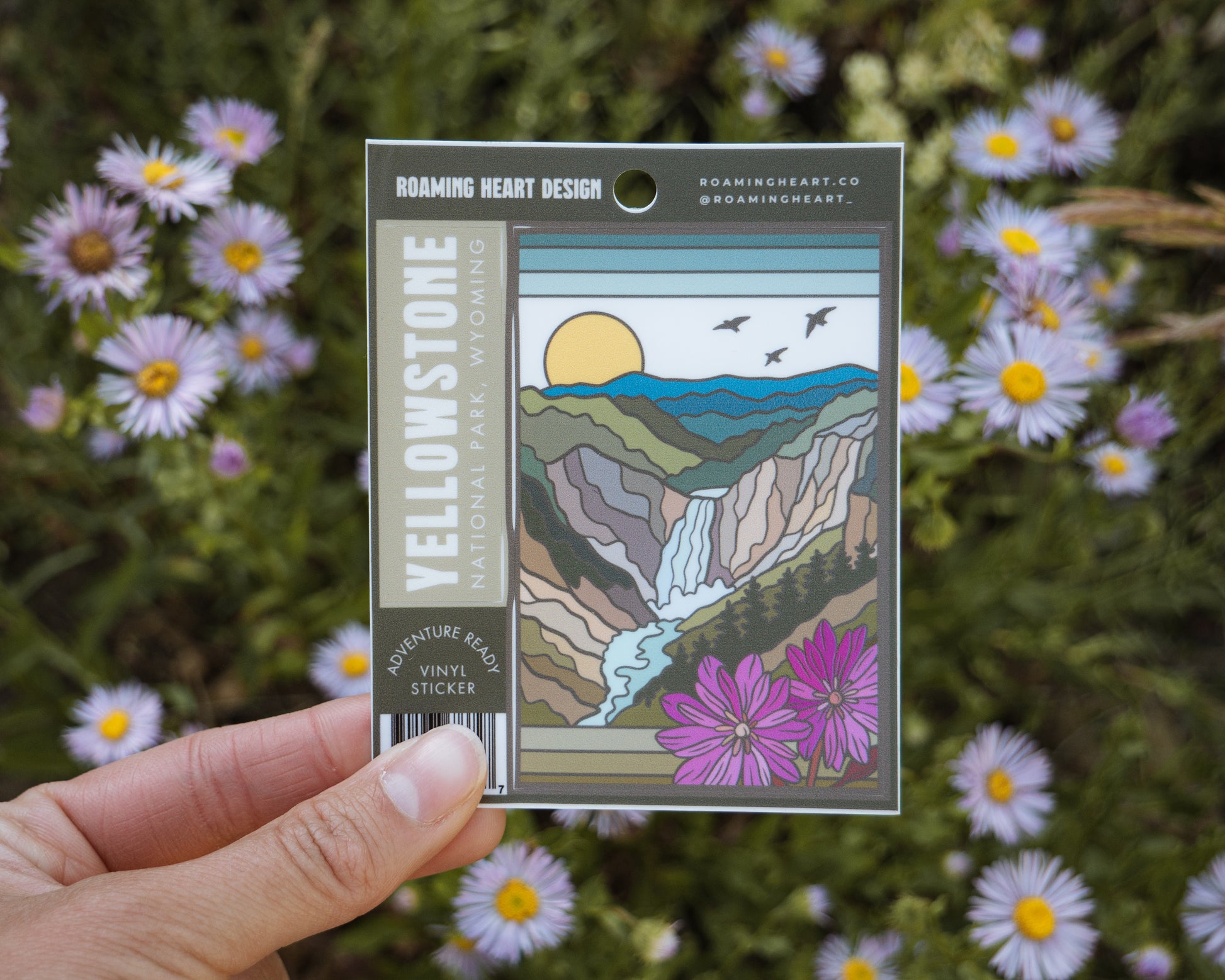 This design features the powerful view of Yellowstone Falls plunging into the Grand Canyon of the Yellowstone, surrounded by vibrant magenta hues of blooming bitterroot—the state flower of Montana and a native wildflower of the region. With bold color and a touch of retro charm, this sticker captures the vastness and beauty of the world’s first national park.